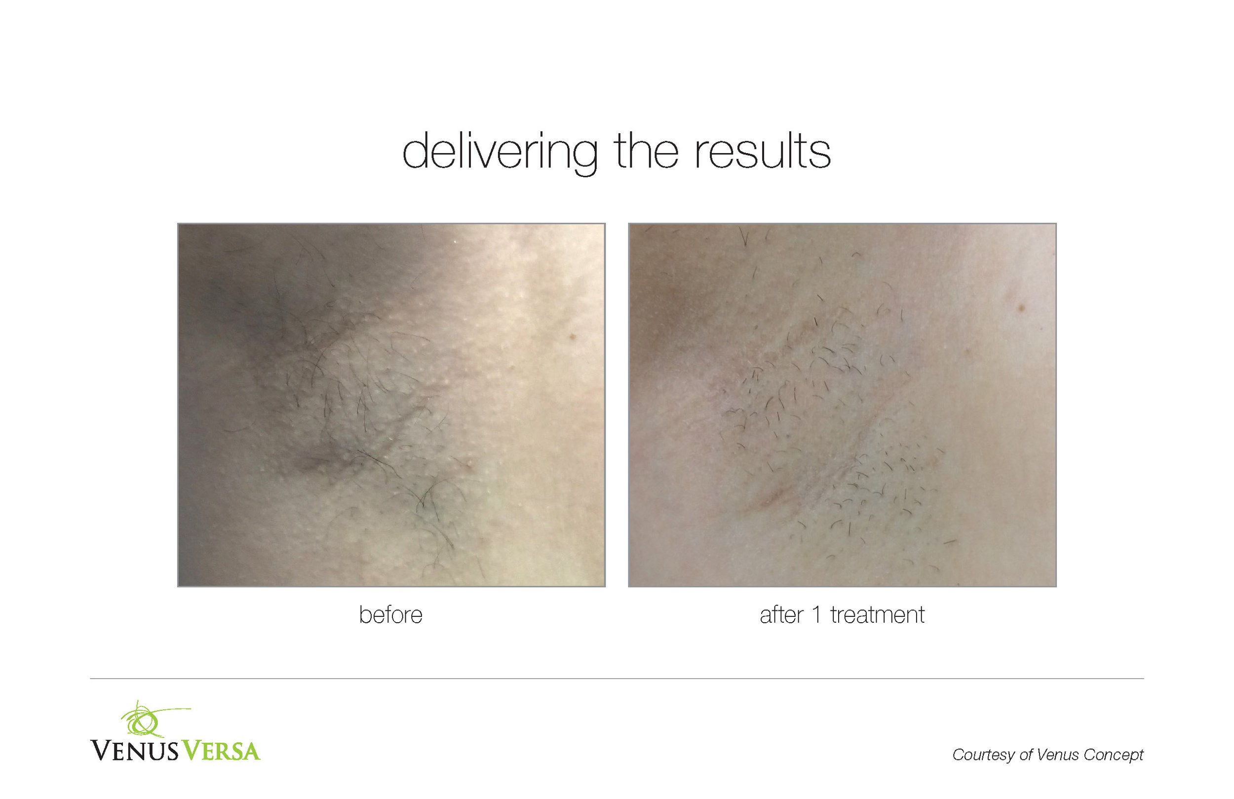 Venus Versa™ hair removal treatments work best for light to medium skin tones. The treatment may work on darker skin, but there is a higher risk of discoloration because darker skin has mroe pigment in it. It’s best to consult with the technician to see if the treatment is right for you. They will perform a test spot and wait between 15 minutes to 48 hours, depending on your skin tone, to assess your reaction to the light.